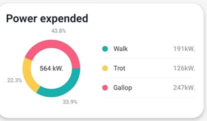 Shows the total power expenditure in the last workout and the proportional division between the three standard gaits: walk, trot and canter.
